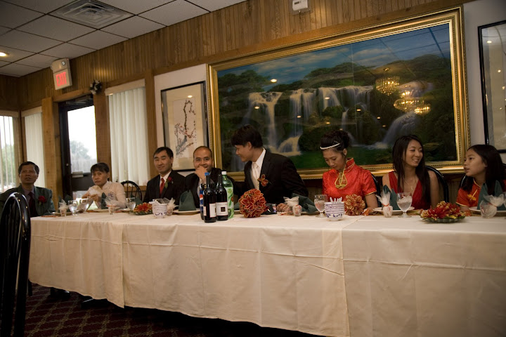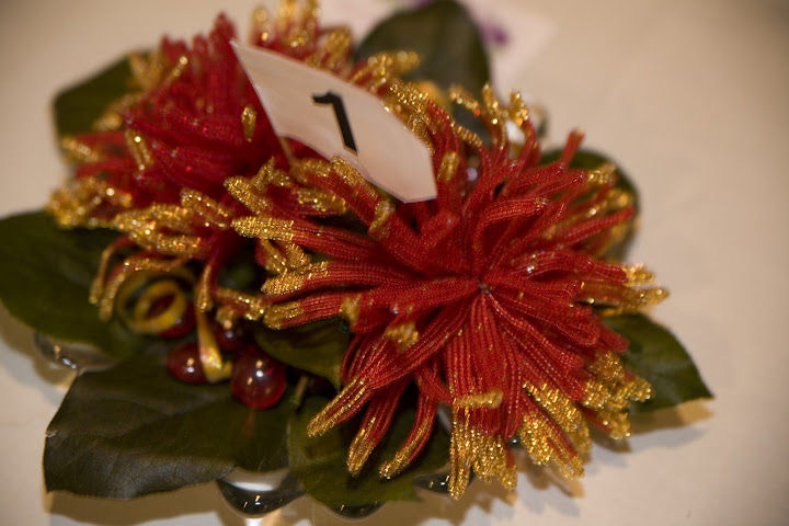 As promised from last week, here is the “beaded” reception. I made all 10 of the table centerpieces. The flowers for the centerpieces are different from my bouquet but had the same color scheme of red and gold. I didn’t have enough time to make leaves so I used real leaves and twigs as an accent. After the reception, my guests were fighting over on who can take it home with them. The cake topper has nothing to do with beads but it’s cute and I love it 🙂 Our cake was a raspberry cheesecake and was soooooo good. Kudos to the Gourmet Cheesecake Shop in West Allis, WI.
